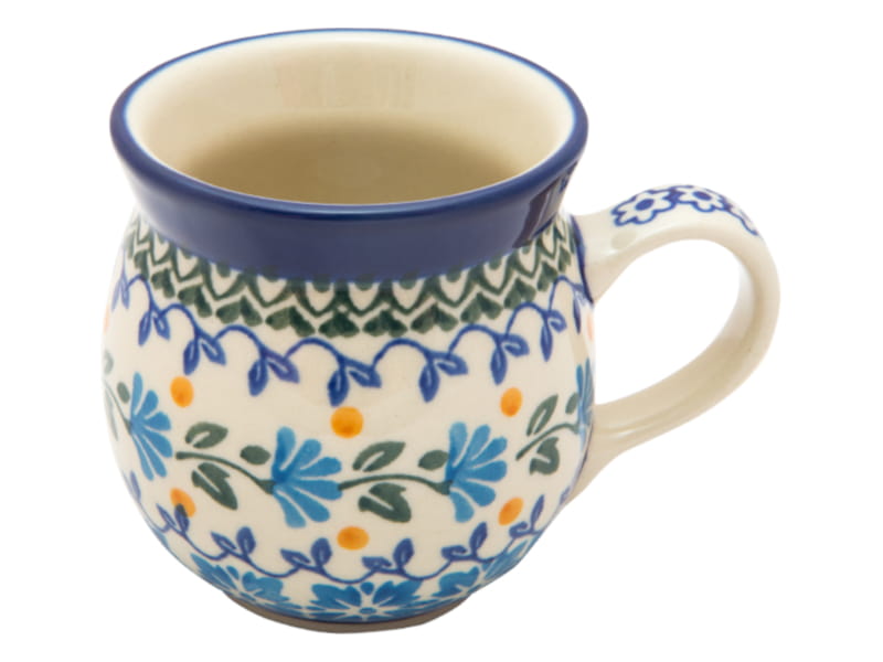Ceramika Bolesławiec - Handmade. Wzór kwiatowy w kolorze niebieskim i drobnymi elementami w kolorze żółtym. Wykończenie obrzeża w kolorze granatowym.