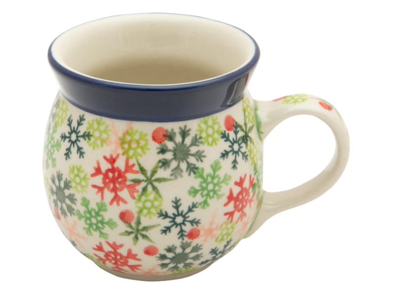 Wzór zimowy, unikat. Różnokształtne płatki śniegu, śnieżynki, w odcieniach zieleni i czerwieni. Wykończenie obrzeża w kolorze granatowym. Ceramika Bolesławiec – HANDMADE.
