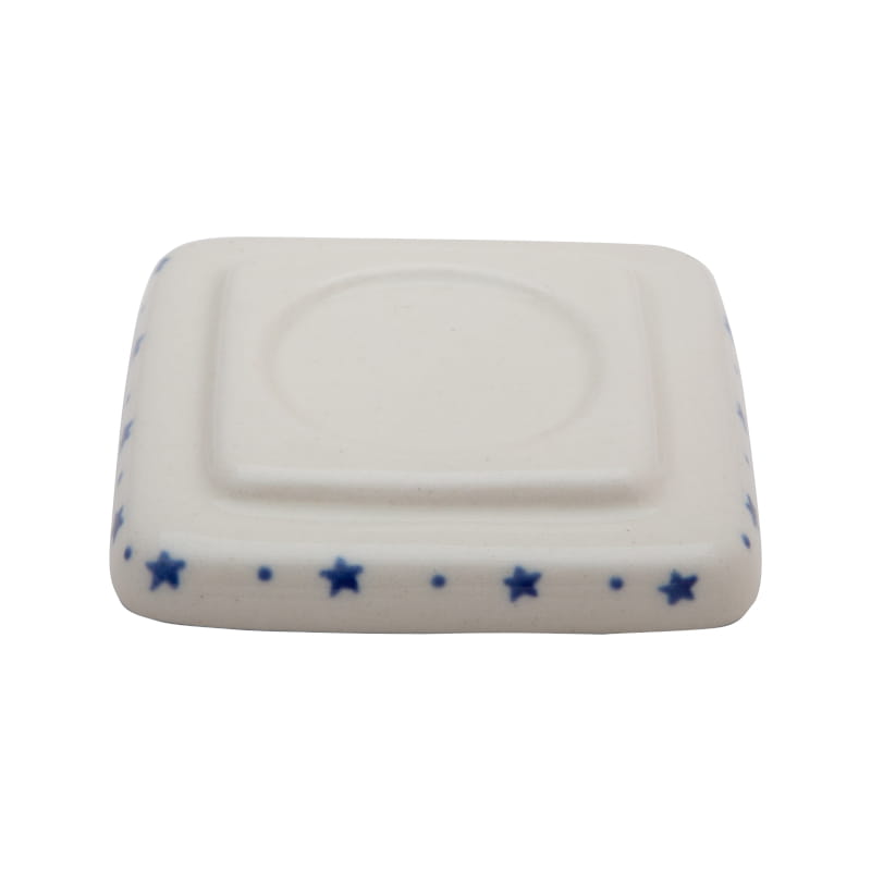 Wzór świąteczny w stylu vintage w kolorach błękitu z choinką, gwiazdkami i śniegiem. Geometryczny wzór kółka i brązowy płot. Wykończenie obrzeża w kolorze granatowym. Ceramika Bolesławiec - HANDMADE.