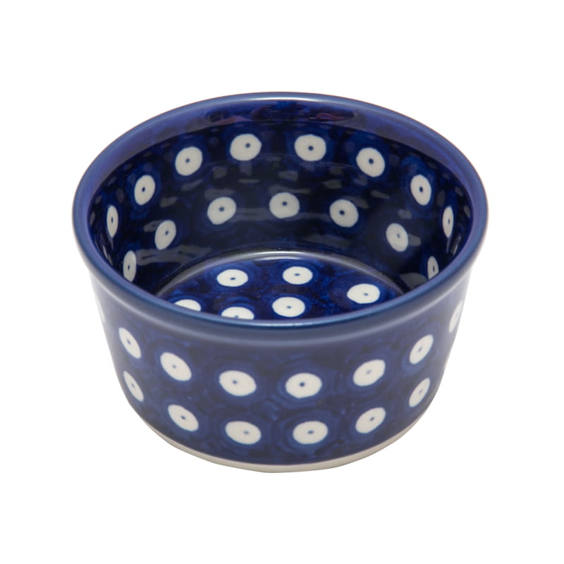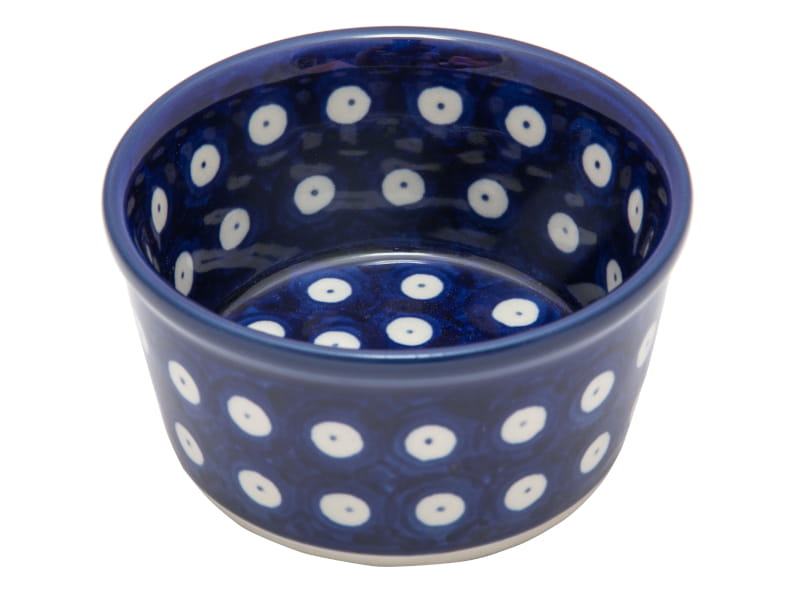 Wzór KLASYCZNY z tłem w kolorze granatowym. Klasyczne kropki Bolesławiec. Wykończenie obrzeża w kolorze granatowym. Ceramika Bolesławiec - handmade.