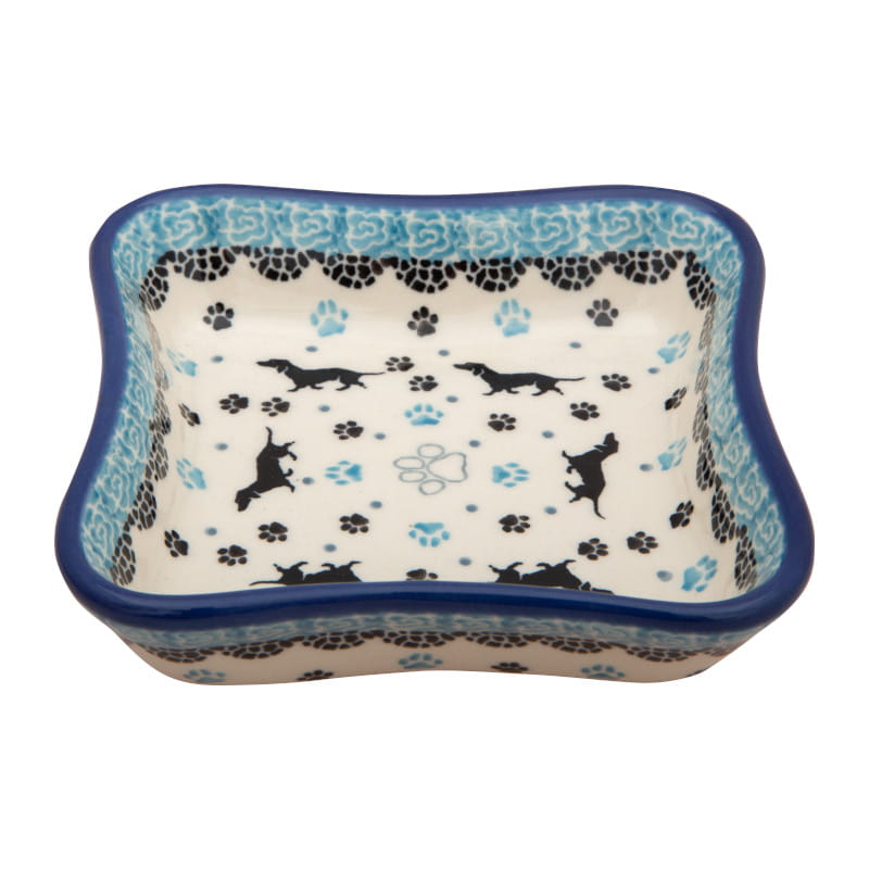 Niepowtarzalny motyw jamników i błękitne lub czarne ślady łap. Idealny dla psiarzy. Delikatne kwieciste wykończenie. Obrzeże w kolorze granatowym. Ceramika Bolesławiec - handmade.