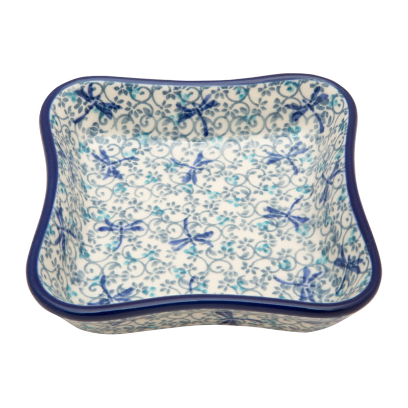 Wzór ważki - granatowe owady na tle jansoniebieksiego wzoru roślinnego. Wykończenie obrzeża w kolorze granatowym. Ceramika Bolesławiec - HANDMADE.