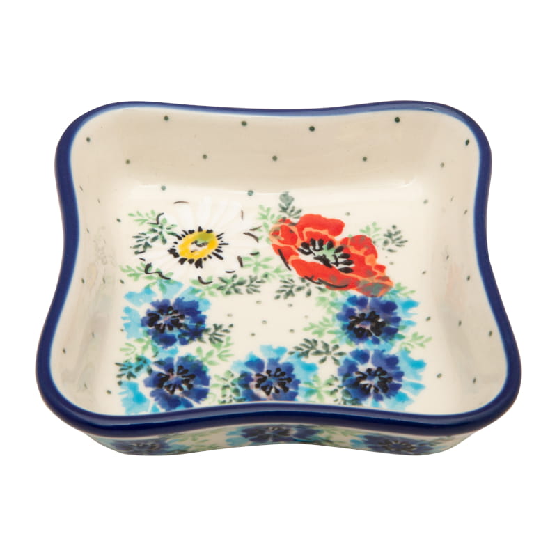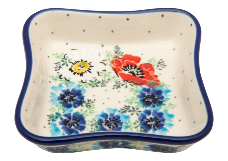 Wzór kwiatowy w kolorach białym, żółtym, czerwonym i niebieskim. Chabry, mak i rumianek otoczone zielonymi listkami i kropkami. Wykończenie obrzeża w kolorze granatowym. Ceramika Bolesławiec - HANDMADE.