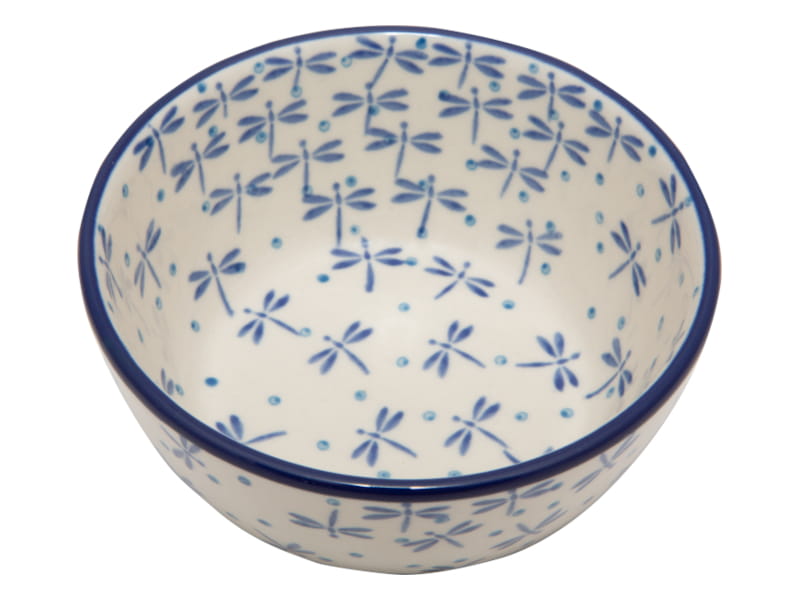 Wzór ważki - niebieski rój owadów i jasnoniebieskie kropki. Wykończenie obrzeża w kolorze granatowym. Design idealny np. do japońskiej herbaty. Ceramika Bolesławiec - HANDMADE.