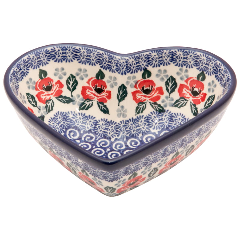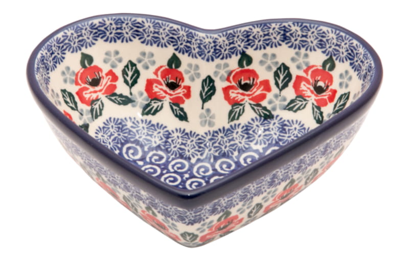 Ceramika Bolesławiec - Handmade. Wzór KWIATOWY w kolorze czerwonym. Wykończenie obrzeża w kolorze granatowym.