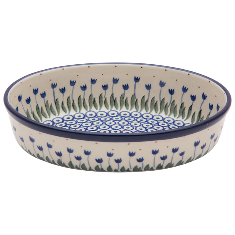 Wzór z motywem roślinnym w kolorach ciemnozielonym i granatowym. Wykończenie obrzeża w kolorze kremowym (naturalny kolor wypalania ceramiki). Ceramika Bolesławiec - HANDMADE.