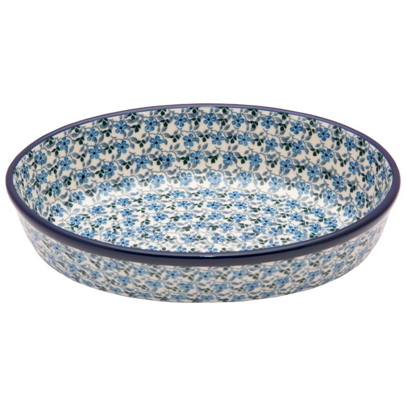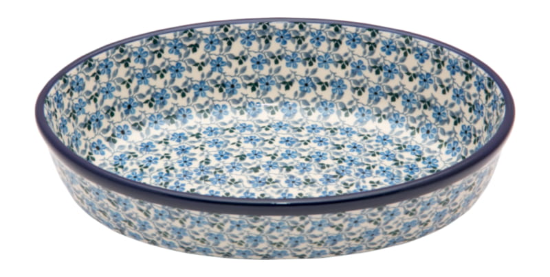 Ceramika Bolesławiec - HANDMADE. Wzór kwiatowy w kolorze błękitnym - NIEBIESKA ŁĄKA. Wykończenie obrzeża w kolorze granatowym.