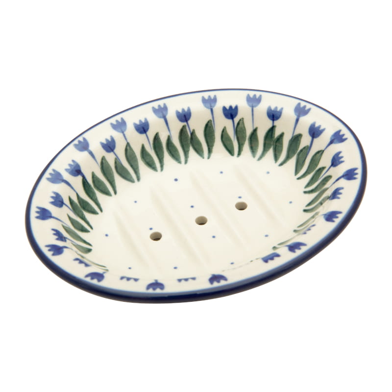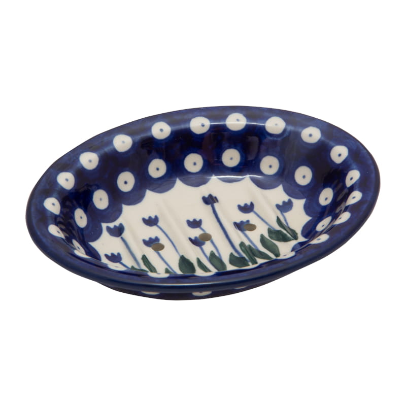 Wzór klasyczny z motywami roślinnymi (tulipany) w kolorach granatowym i zielonym. Wykończenie obrzeża w kolorze granatowym. Ceramika Bolesławiec - HANDMADE.