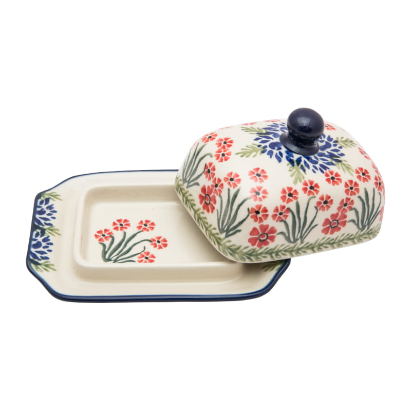 Maselniczka na pół kostki masła. Ceramika Bolesławiec - HANDMADE. Wzór kwiatowy w kolorze czerwonym. Wykończenie obrzeża w kolorze granatowym.