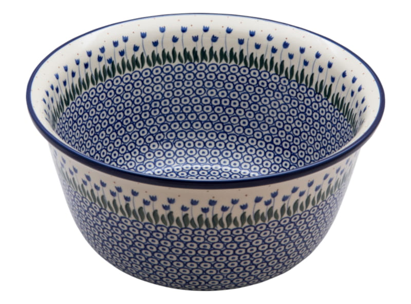 Wzór klasyczny z motywami roślinnymi (tulipany) w kolorach granatowym i zielonym. Wykończenie obrzeża w kolorze granatowym. Ceramika Bolesławiec - HANDMADE.