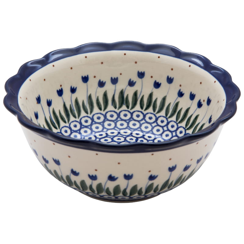 Wzór klasyczny z motywami roślinnymi (tulipany) w kolorach granatowym i zielonym. Wykończenie obrzeża w kolorze granatowym. Ceramika Bolesławiec - HANDMADE.