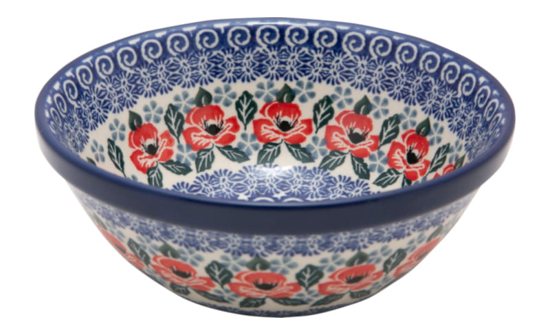 Ceramika Bolesławiec - Handmade. Wzór KWIATOWY w kolorze czerwonym. Wykończenie obrzeża w kolorze granatowym.