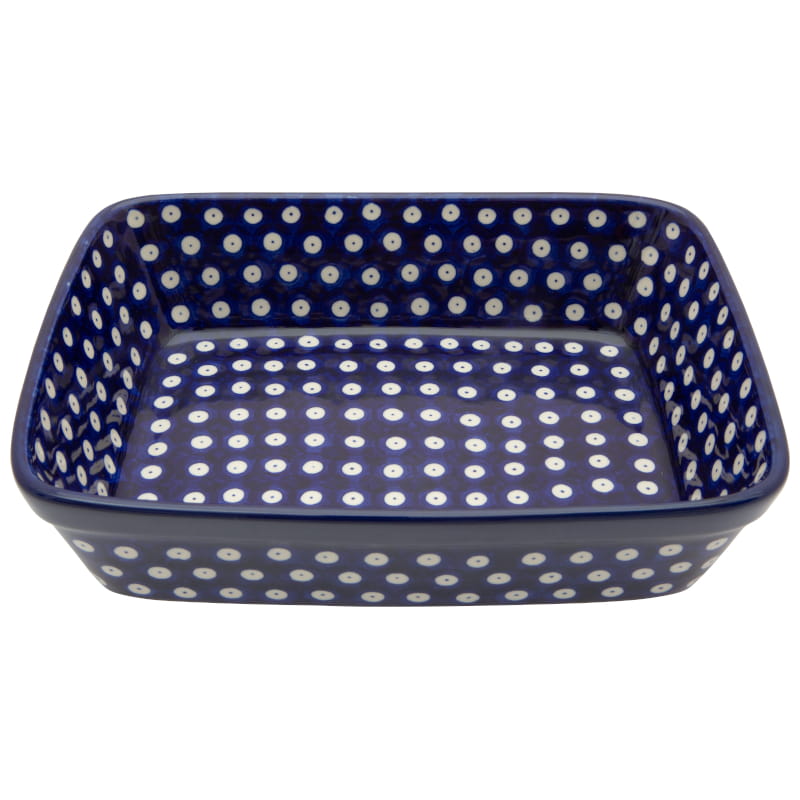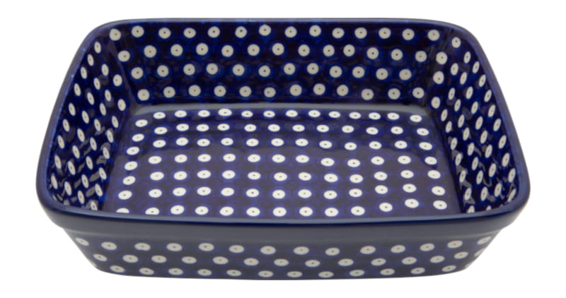 Wzór KLASYCZNY z tłem w kolorze granatowym. Klasyczne kropki Bolesławiec. Wykończenie obrzeża w kolorze granatowym. Ceramika Bolesławiec - handmade.