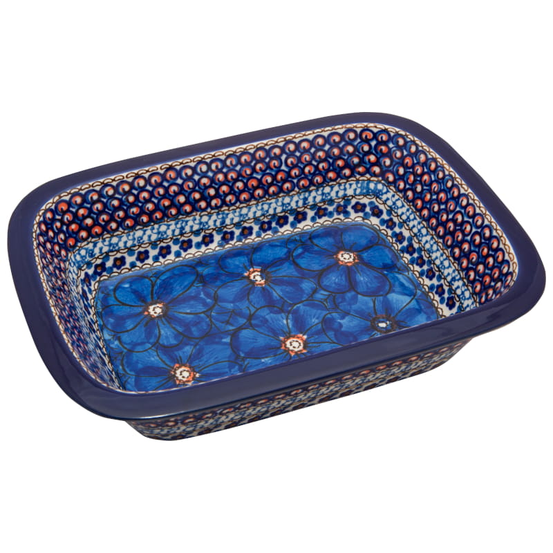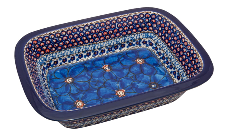 Wzór UNIKATOWY z kwiatami w kolorze niebieskim. Wykończenie obrzeża w kolorze granatowym. Ceramika Bolesławiec - HANDMADE.