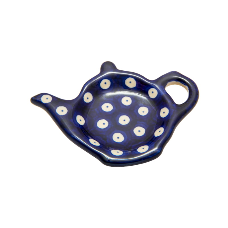 Wzór KLASYCZNY z tłem w kolorze granatowym. Klasyczne kropki Bolesławiec. Wykończenie obrzeża w kolorze granatowym. Ceramika Bolesławiec - handmade.