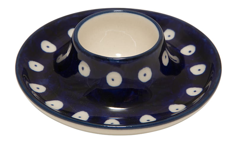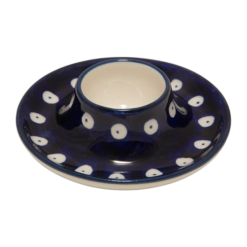 Dekoracja KROPKI Bolesławiec. Wzór KLASYCZNY z tłem w kolorze granatowym. Wykończenie obrzeża w kolorze granatowym. Ceramika Bolesławiec - handmade.