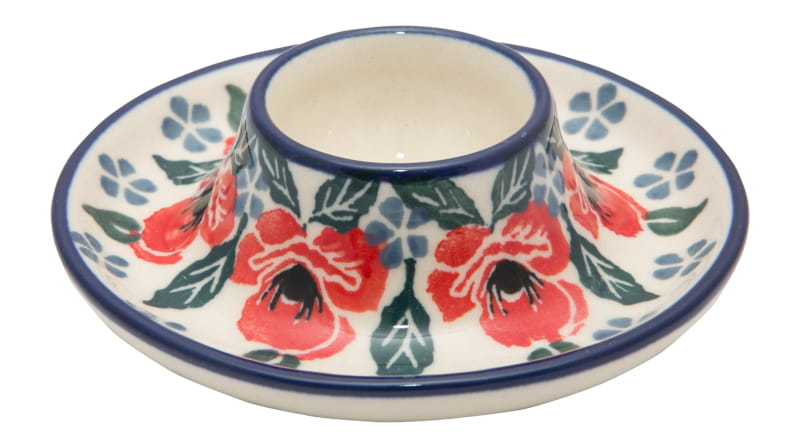 Wzór KWIATOWY w kolorze czerwonym. Wykończenie obrzeża w kolorze granatowym. Ceramika Bolesławiec - Handmade.