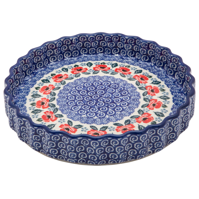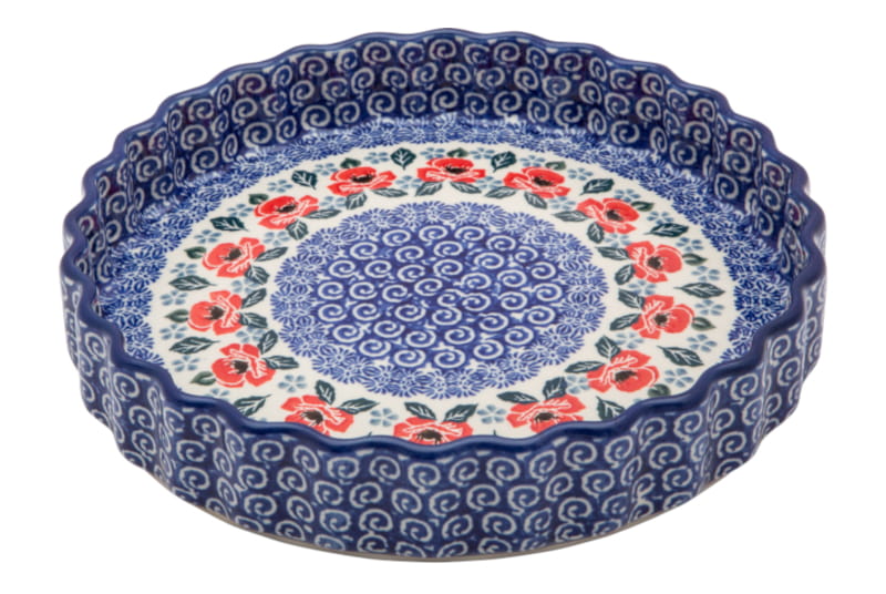 Wzór KWIATOWY w kolorze czerwonym. Wykończenie obrzeża w kolorze granatowym. Ceramika Bolesławiec - Handmade.