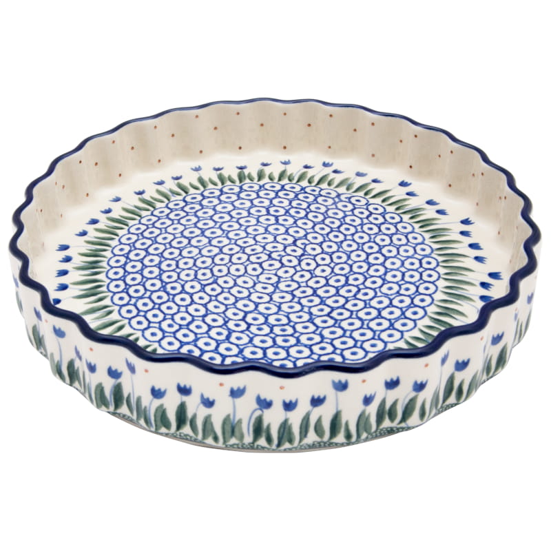 Wzór klasyczny z motywami roślinnymi (tulipany) w kolorach granatowym i zielonym. Wykończenie obrzeża w kolorze granatowym. Ceramika Bolesławiec - HANDMADE.