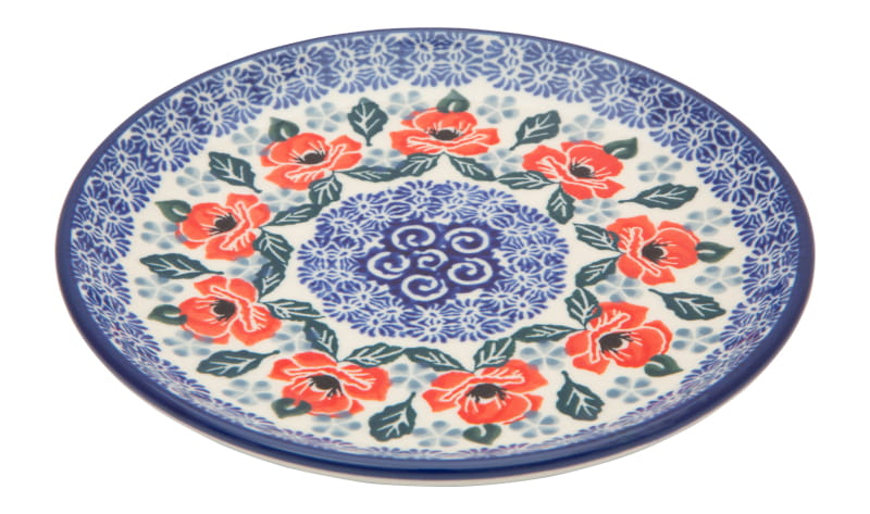 Wzór KWIATOWY w kolorze czerwonym. Wykończenie obrzeża w kolorze granatowym. Ceramika Bolesławiec - Handmade.