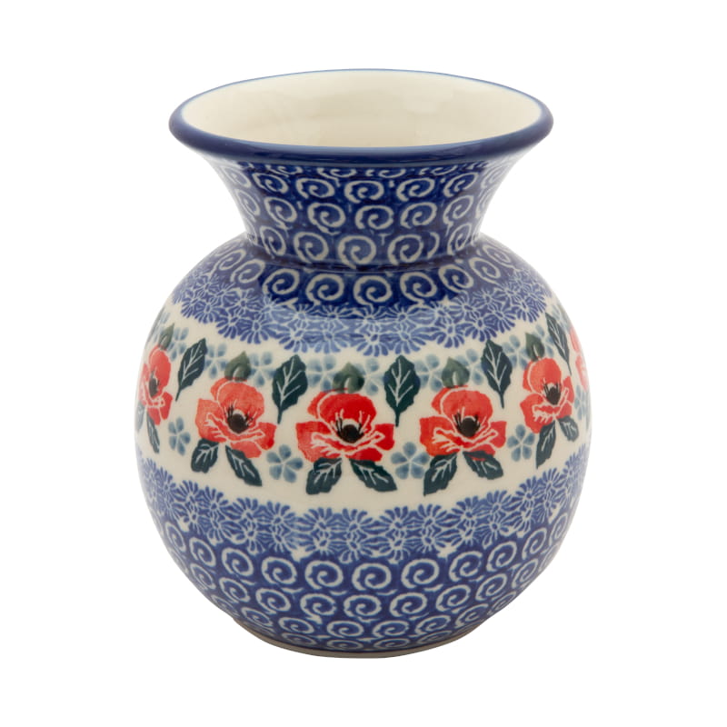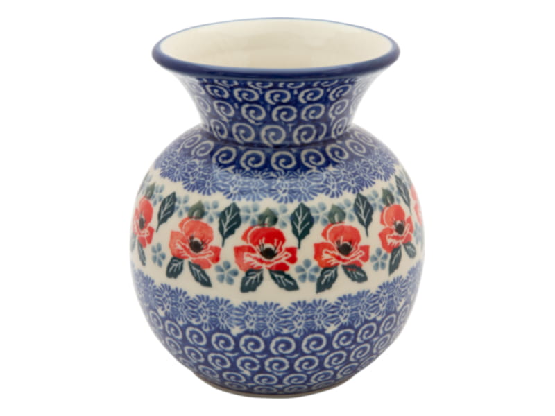 Ceramika Bolesławiec - Handmade. Wzór KWIATOWY w kolorze czerwonym. Wykończenie obrzeża w kolorze granatowym.